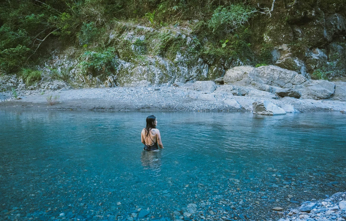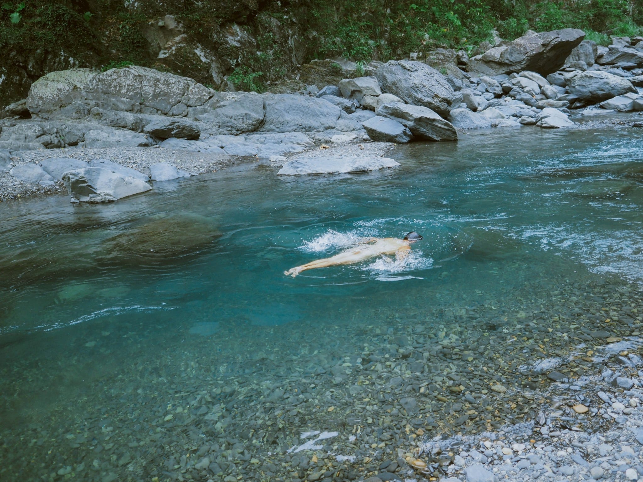 當我把泳衣穿好時,伴侶已經咚咚咚地把所有衣服脫光跳進溪水裡了,我一邊大笑一邊謹慎地感受9月底溪流的溫度,慢慢從腳踝包覆到腰間,再整個人沉入流動的夏末裡。