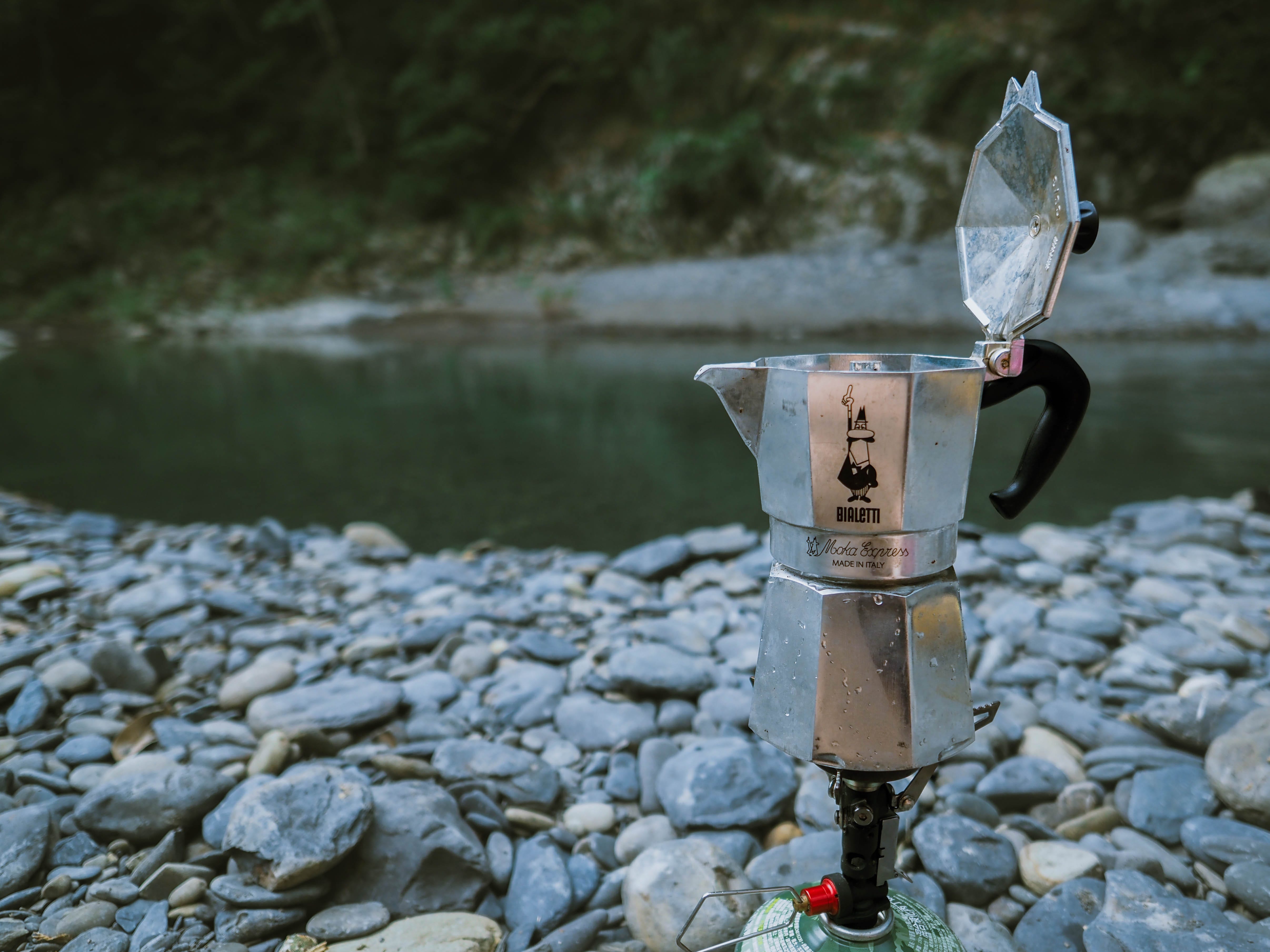 平常在山上為了省裝備的重量給相機跟鏡頭,所以只能選擇用即溶咖啡粉,奢侈一點就帶濾掛。這次難得到一個車子就能抵達的溪流,索性就背了摩卡壺跟鮮奶,咖啡的油脂泡沫與濃郁的香氣從頂部慢慢流出,我吞了一口口水。
