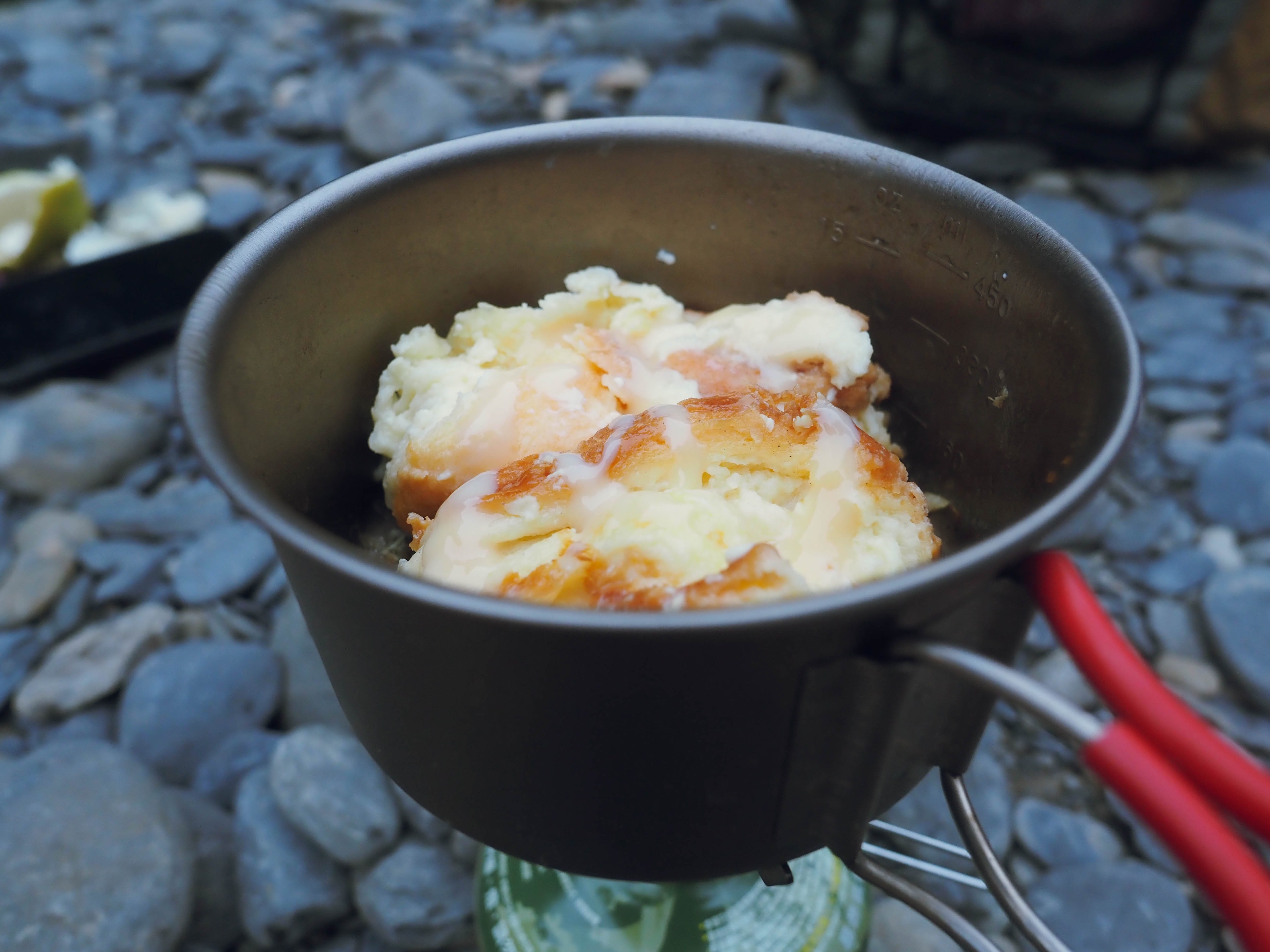 我把包包的東西拿出來:4人份濃縮摩卡壺(裡面已經裝了磨好的深焙咖啡粉)、牛奶、2顆雞蛋、鮮奶吐司、煉乳、龍口牌冬粉、711獅子頭調理包、瓦斯罐顱頭、林敬峰的《山、獸與雜魚》書,還有Olypmus E-M10 4相機。
